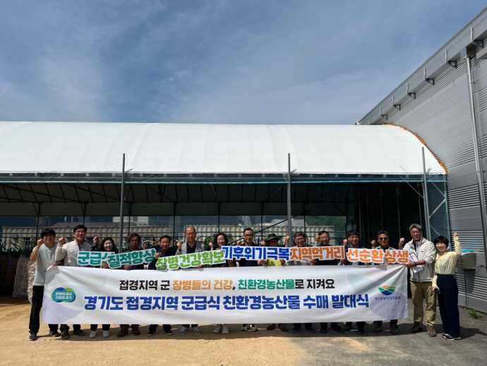 ▲17일 경기도농수산진흥원이 북파주 집하장에서 도 접경지역산 친환경농산물의 군급식 공급을 위한 수매 발대식을 진행한 후 기념 촬영을 하고 있다. 사진=경기도농수산진흥원