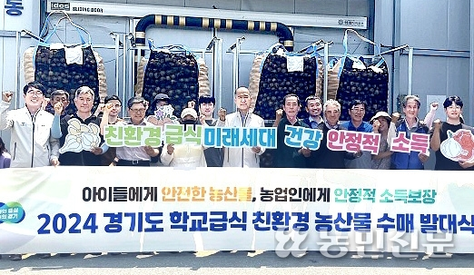▲경기도농수산진흥원(원장 최창수)이 10일 경기 안성에서 ‘친환경 학교급식 계약재배 농산물 수매 발대식’을 열고 본격적으로 매입에 들어갔다.